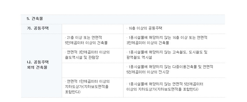 안전관리계획서 제출대상인 1종 및 2종 시설물을 대략 살펴보면 도로와 철도로 나뉘는 교량, 도로터널과 철도터널로 나뉘는 터널, 갑문시설, 계류시설, 댐으로 나뉘는 항만, 공동주택, 공동주택 외의 건축물로 나뉘는 건축물, 하천, 상하수도 등이 포함됩니다.